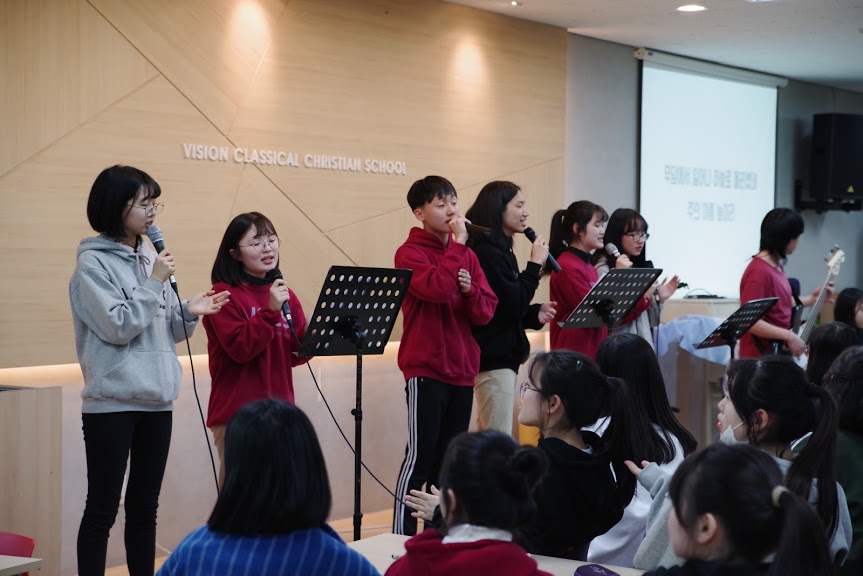 작년까지는 한 학기에 한 번씩 전교생이 다 함께 모여 남서울비전교회에서 연합예배를 드렸었다. 그러나 올해부터는 두 학년씩 묶어서 연합예배를 드리는 방식으로 바뀌었다. 그리고 2019년 첫 연합예배가 4월 8일부터 11일까지 진행되었다. 그중, 9,10학년 연합예배는 4월 9일이었다. 예배 순서는 6시부터 7시까지 반별 시간을 갖고, 7시부터 8시까지는 9,10학년 모두가 청어람에 모여 함께 예배를 드리고, 8시부터 9시까지는 학년을 섞어서 함께 시간을 보냈다. 찬양은 9,10학년 예배인도자 학생들이 주축이 되어 이끌어주었고, 말씀은 여행 선생님이 ‘왜 염려하느냐?’라는 주제로 전해주셨다. 그리고 반별 시간과 9,10학년 함께하는 시간은 각 반 섬김이들이 모여서 회의한 후 프로그램을 진행했다.